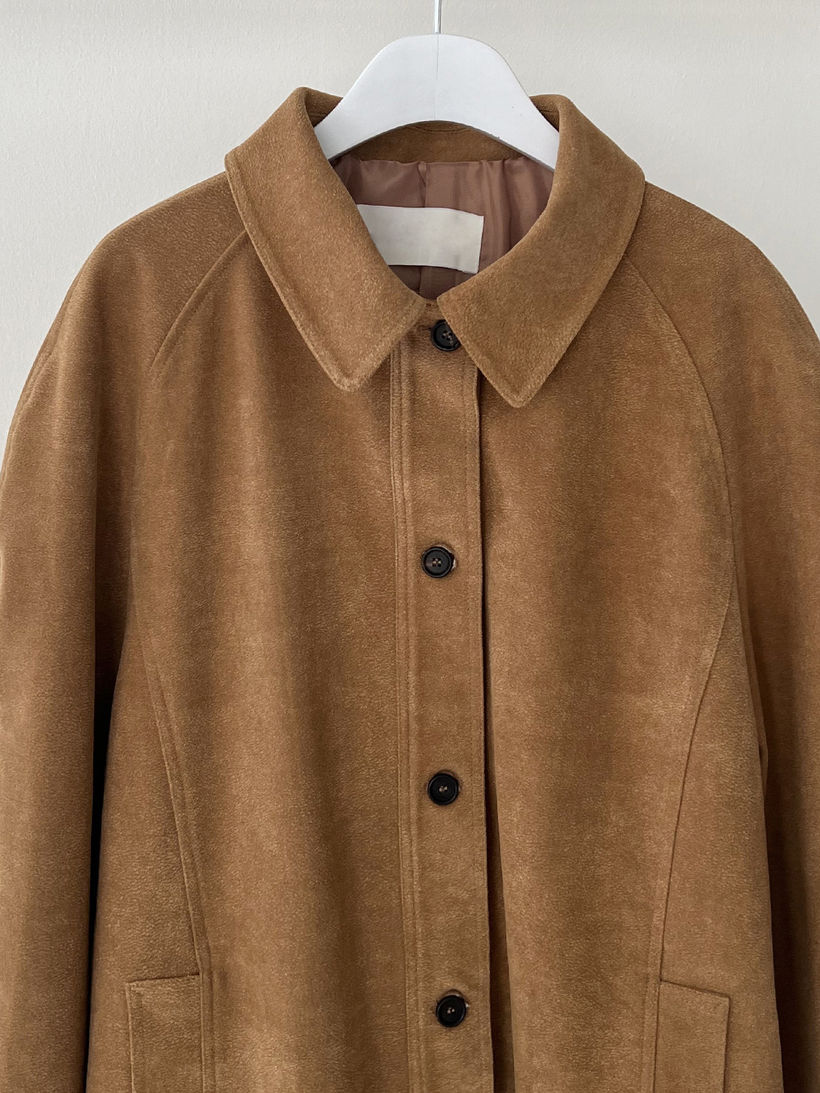 This is a stylish suede jacket with a vintage mood. With a clean silhouette and a standard feel without unnecessary details, it's perfect for various styling. The luxurious feel of suede and the design give a very stylish impression. It's made in an oversized fit with a moderate length. The raglan sleeve and curved shape provide a solid outfit without the need for separate shoulder pads. A must-have item for the transitional season that can be styled casually or formally.