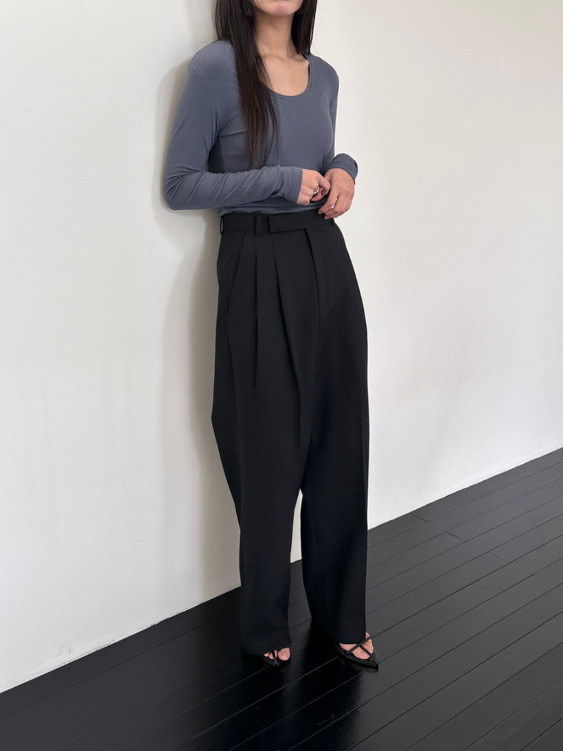 Introducing these charming wide-leg pants featuring a distinctive deep pleat detail. Crafted from a robust fabric, these pants maintain a powerful drape without being overly flowing. With a formal yet sleek design, the pants showcase a chic fit with a two-pleat detail and a wide-leg silhouette, providing both comfort and a sophisticated look. The semi-high-waisted design and wide fit ensure an elegant and flattering drop, making these pants truly stylish. Versatile enough for a comfortable and casual look with sneakers, yet suitable for a formal ensemble, these pants offer excellent adaptability for various occasions.